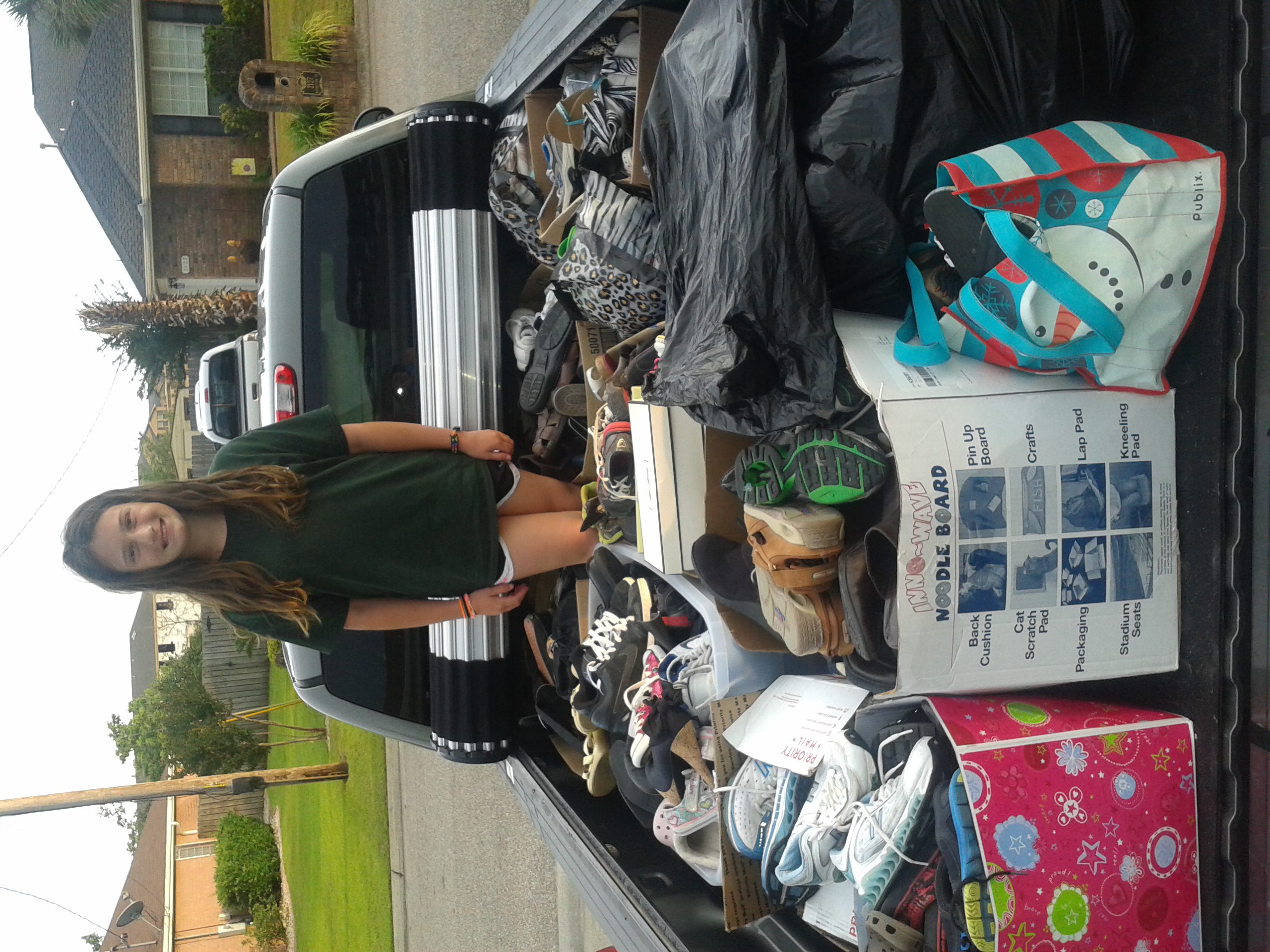Carlie Jeffries stands among the 475 pairs of shoes she collected for Soles4Souls.