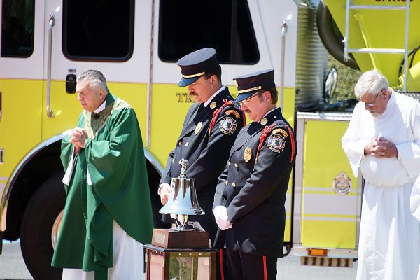 Father John Kelly (left) leads a prayer during a 9/11 ceremony at St. Sylvester Catholic Church.