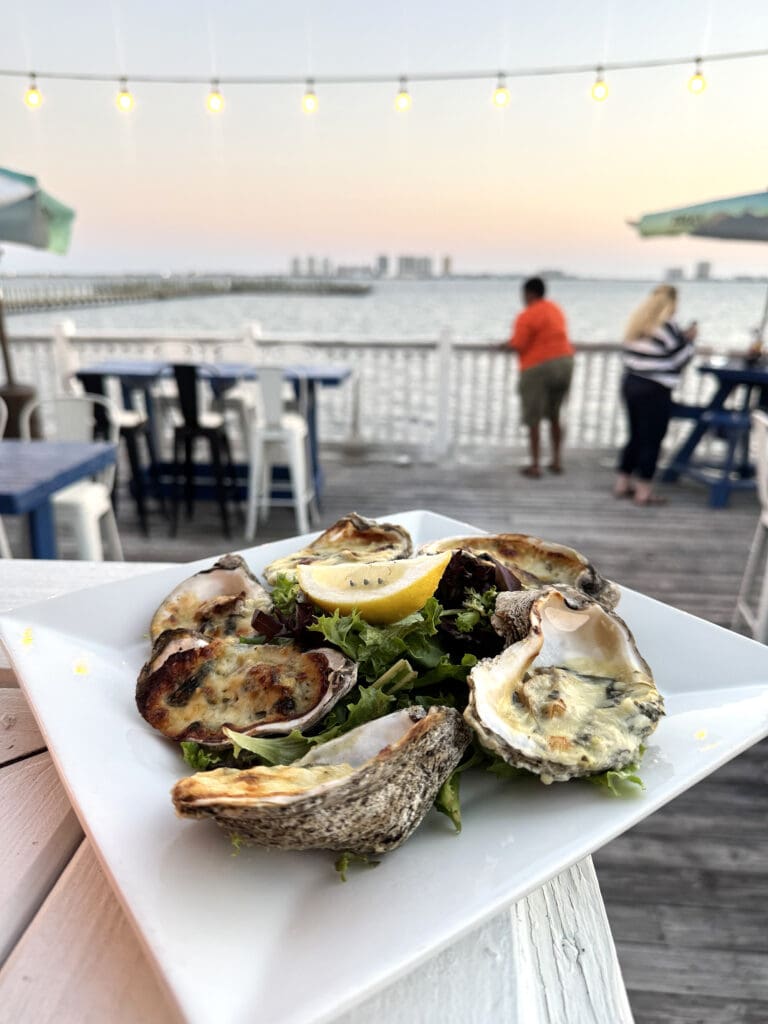 Emerald Waterfront sells a variety of oysters, both raw and oven-roasted, at their oyster bar back by the outside bar. Chef Nick says it makes for a great aroma while the oysters are roasting in the oven.