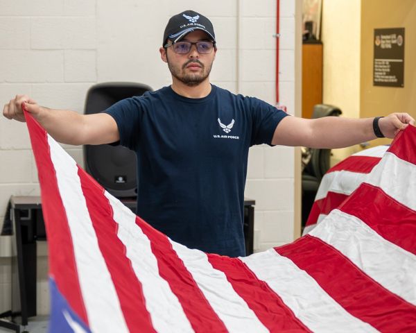 Airman 1st Class Mathew Sharp holds a U.S. flag during a practice session with the Air Force Honor Guard at Homestead Air Reserve Base, Fla., on Nov. 14, 2023. This image reflects Sharp’s remarkable recovery and resilience following a severe accident a year prior. (U.S. Air Force photo by Tech. Sgt. Lionel Castellano)