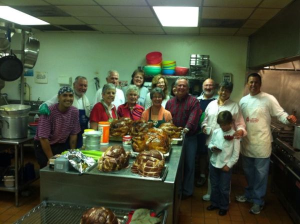 Kitchen volunteers prepare a Thanksgiving meal for the Residential Treatment Center/Pathways for Change program at Gulf Breeze United Methodist Church.