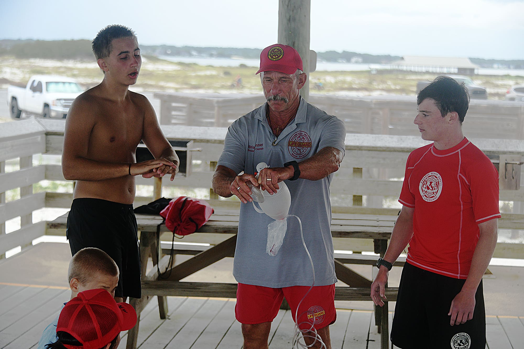 Navarre Beach Lifeguard instructor Brian Renner (middle) teaches two boys with Junior Lifeguards how to perform CPR on a patient. The CPR/first aid lesson also went over how to use different medical devices to help people in emergency situations.