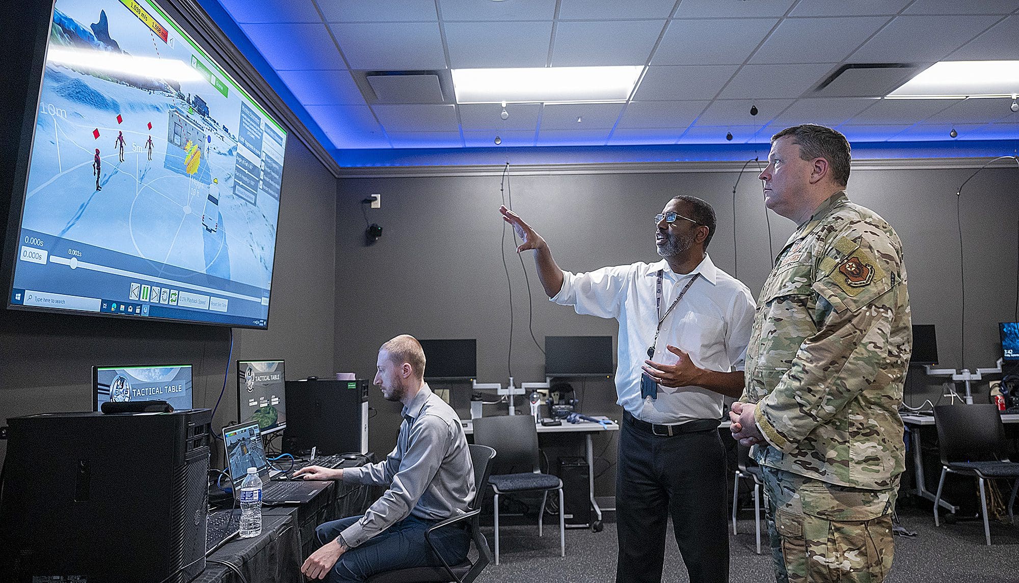 Lt. Gen. Tony Bauernfeind, AFSOC commander, is briefed on a new capability of the Extended Reality training on September 29, 2023, as a part of a larger XR training demonstration. With a comprehensive XR Training Framework in place, AFSOC is poised to transform its training methodologies, ensuring that Air Commandos are better prepared and equipped for strategic competition.