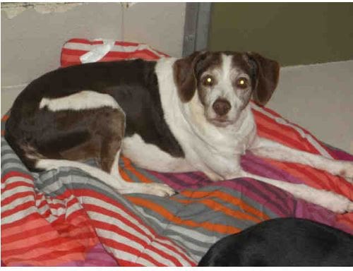 Diamond is a 12 year old spayed female Brittany mix. This sweet girl is bonded to her friend, Shadow, also 12 years old, pictured below. Would be great if they could be adopted together.
