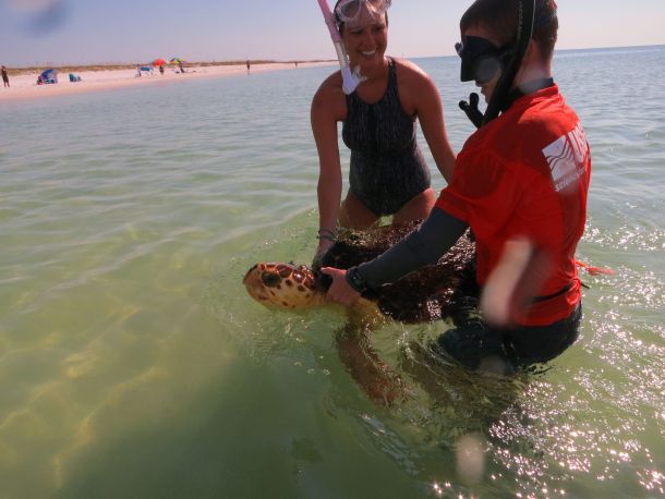 When researchers pulled Lou Lou, an adult loggerhead sea turtle, to the surface along Navarre Beach Sept. 19, they were surprised to find that she had a few pieces missing.