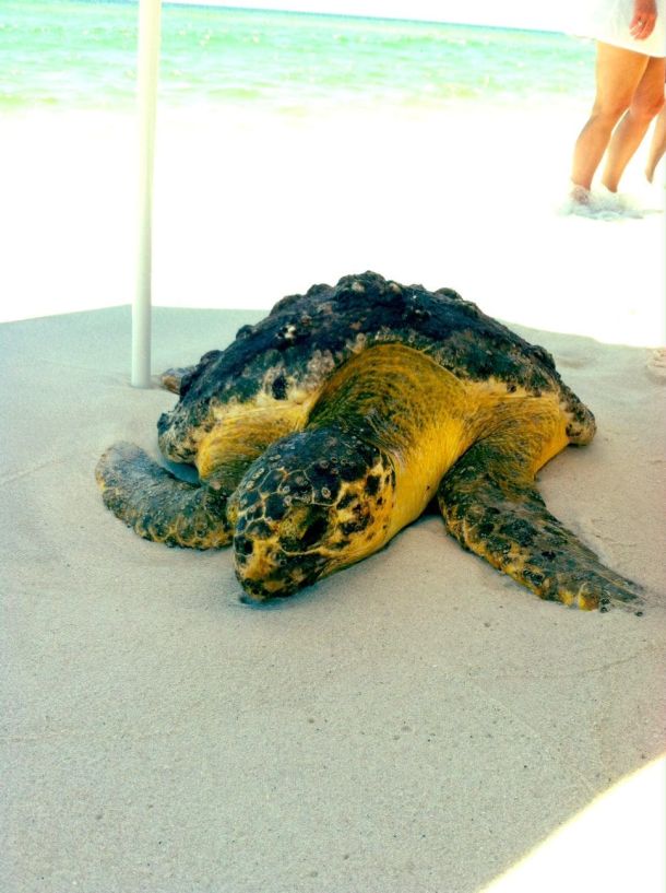 Three kayak fishermen rescued a badly injured Loggerhead sea turtle Tuesday after they found it exhausted and close to death about a half-mile off shore at Navarre Beach.