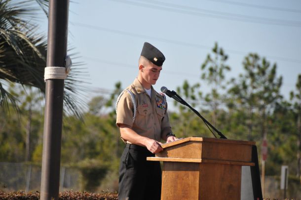 On a cool, sun-splashed Wednesday morning, with miniature American flags blowing in the light breeze on the lawn in front of Navarre High School, Navarre’s Navy Junior ROTC commanding officer Arianna Clemente-Hunter spoke during a ceremony to commemorate Pearl Harbor Day.