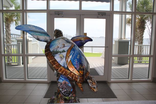 A brightly painted sea turtle statue commissioned by the Santa Rosa County Tourism Development Office arrived Tuesday, Aug. 23, at the Navarre Visitor Information Center.