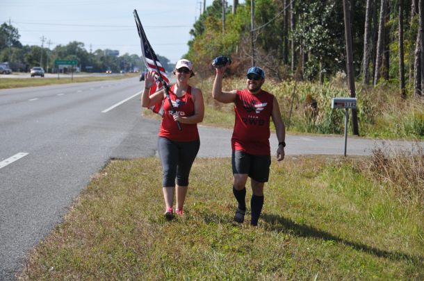 As the warm November sun beat down on them, Kristy and Bryan West walked along U.S. Highway 98 through Navarre holding an American flag.