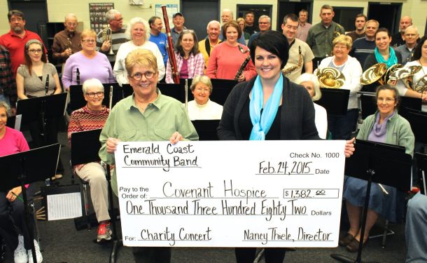 The Emerald Coast Community Band donated $1,382, the money raised from its holiday concert, to Covenant Hospice. The money will benefit programs such as bereavement services, children’s support programs, spiritual support services and charity care. Covenant Hospice accepts patients regardless of ability to pay. In 2014, the organization provided more than $1.7 million in care for uninsured or under-insured patients facing a terminal illness.
