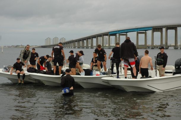 Five three-man teams of divers – three Army and two Navy – hit the Santa Rosa Sound in Navarre at about 8 a.m. Saturday heading off on a 25k race to raise money for the Fisher House of the Emerald Coast. The Fisher House at Eglin Air Force Base provides military families housing close to a loved one during hospitalization for an illness, disease or injury.