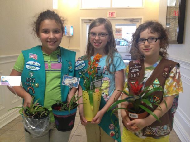 Dozens of badge-clad Girl Scouts held on to pots of colorful flowers to bring some cheer to senior citizens last week. The girls hand-delivered potted plants last Wednesday and visited with the residents at Bay Breeze Nursing and Retirement Center.