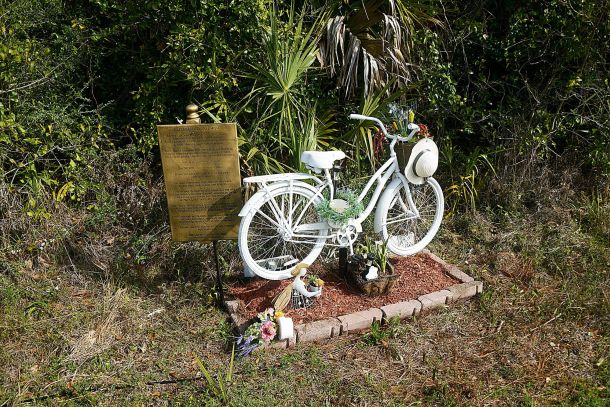 The memorial to Elizabeth Dawn Allmon, a homeless woman better known around Navarre as the ‘bike lady,’ has sat alongside U.S. Highway 98 for well over a decade. At times the memorial, which is a white bike with flowers around it and a plaque telling who Allmon was, has fallen into disrepair.