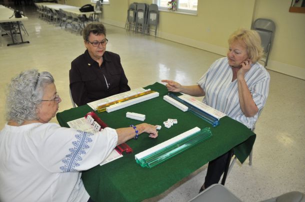 It’s late on a Friday morning and there are a couple of tables set up in the Holley Navarre Senior Center. Three people are at each one. They are playing a game called mahjong, which originated in China and is sort of like cards.