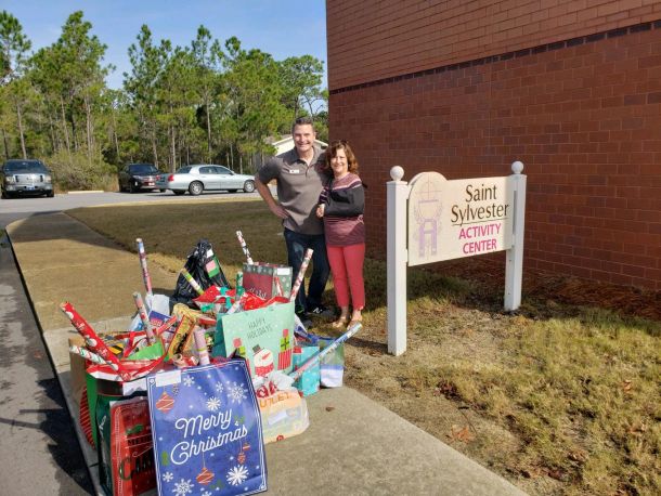 Ann Marie Corbett, representing the Navarre Garden Club, is shown in this photo delivering Angel Tree Christmas gifts to an unidentified representative of Caring and Sharing of South Santa Rosa County.