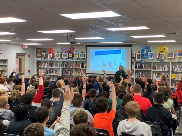 Students at Holley Navarre Middle School met in the library Feb. 23 to hear a special presentation from a Santa Rosa Sheriff’s deputy concerning drug use and vaping.