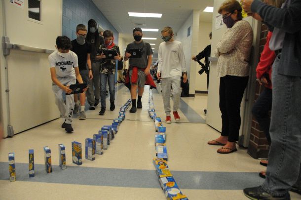 Aydin Henry walked fast through the hallways of Woodlawn Beach Middle School with several of his classmates filming the footage of the macaroni and cheese boxes tumbling down like dominoes.