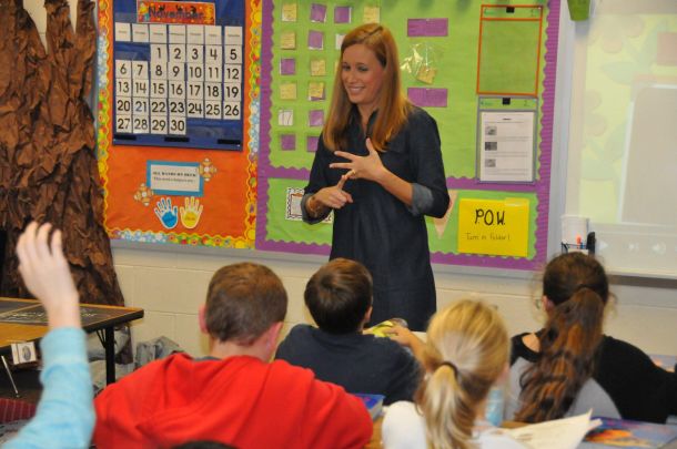 Christina Andrus walks into her first-grade classroom at West Navarre Primary and lets her class know she is going to read them a story.
