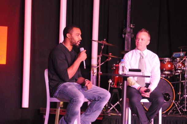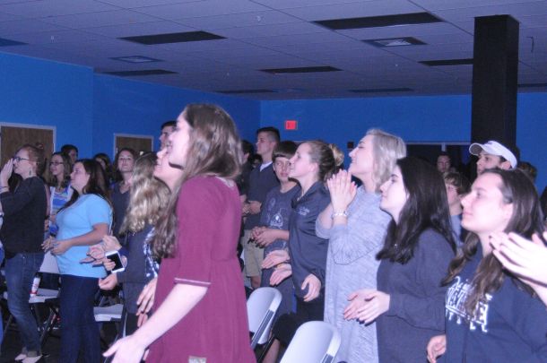Students hang on every word as Ray Millsap speaks to them inside a room at the Funplex in Gulf Breeze that is only lit by stage lights.