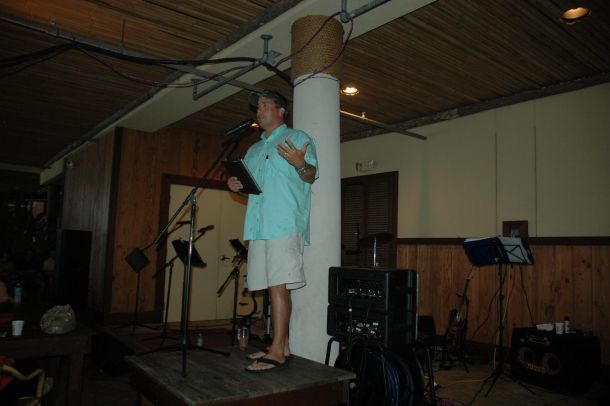 Jack Kale, pastor at the recently established Central Waterside Church, didn’t let the rain stop him from leading a service at the Bimini Beach Bar Sunday morning.