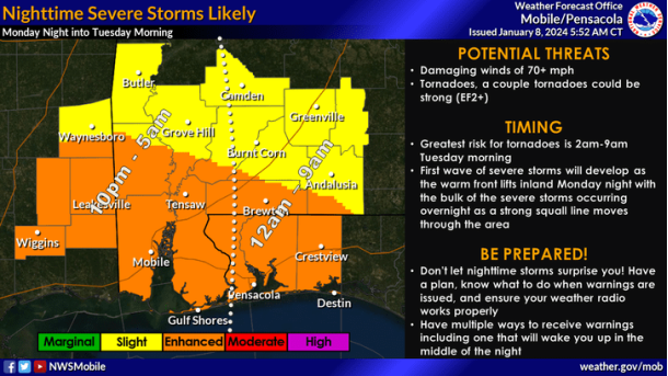 The National Weather Service in Mobile is predicting severe weather conditions in the overnight hours of Monday night (Jan. 8) into Tuesday morning (Jan. 9) for our area. Santa Rosa County has been placed under an enhanced risk for severe weather.