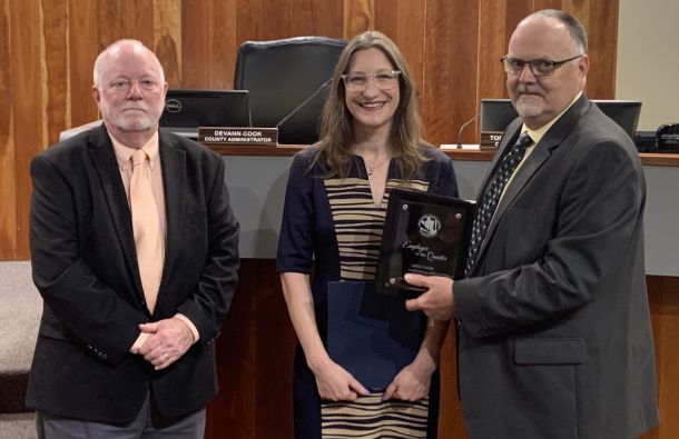 Ginny Davis, who has been described as ‘the face of Emergency Management’ because of her efforts to educate residents about disaster preparedness at community events, is the Santa Rosa County Employee of the Quarter for the Fourth Quarter of 2022. Santa Rosa County Assistant Administrator Brad Baker holds a plaque he presented to Davis at the county commission’s meeting Thursday. Also pictured is Administrator DeVann Cook.