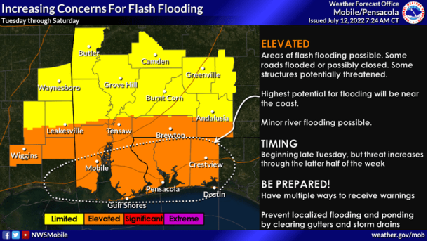 Heavy rainfall and localized flash flooding, particularly of low lying and urban areas, is possible beginning late today, Tues., July 12, with the threat increasing through Sunday morning, according to the US National Weather Service in Mobile.