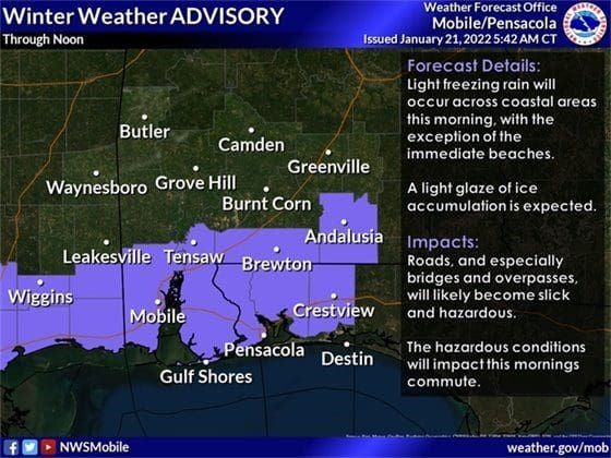 The US National Weather Service (NWS Mobile) office has placed Santa Rosa County (except the immediate beaches area) under a winter weather advisory until 12 p.m. Friday.