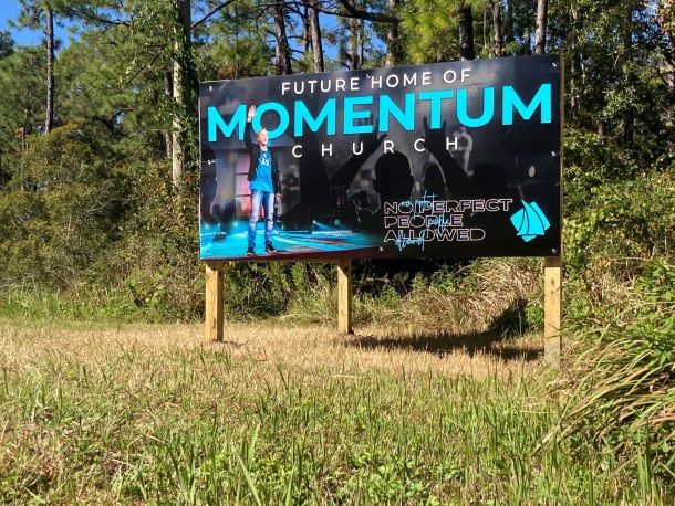 The road sign on a wooded lot on U.S. Highway 98 across from the Tiger Point Publix announces the future location of Momentum Church and assures that “No perfect people are allowed.”