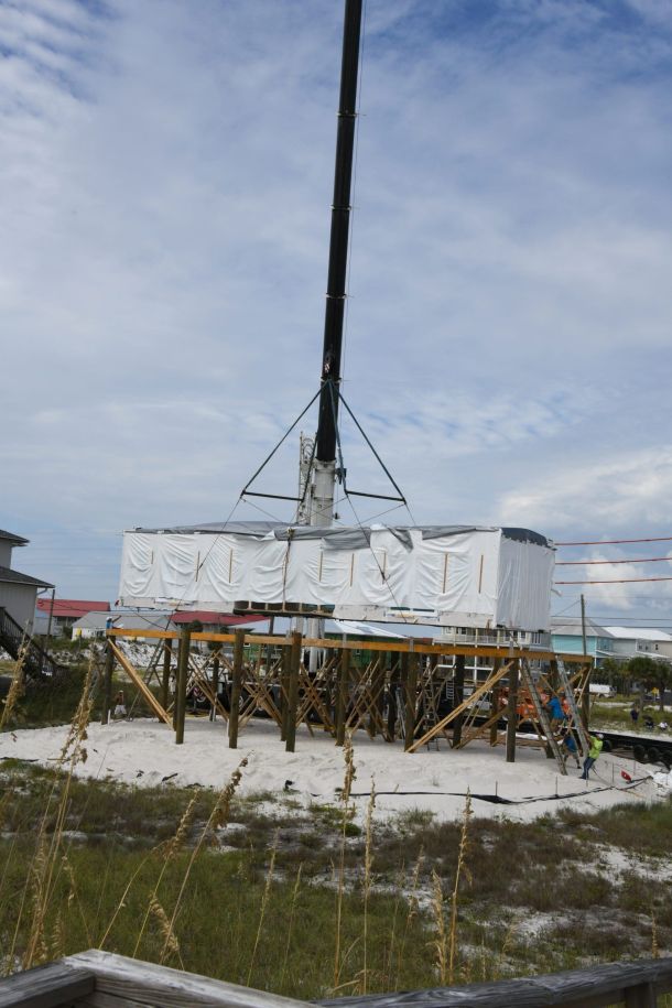 By just after noon, one-quarter of a 3,000-plus square foot home had been trucked down the road, lifted and lowered into place. Within a few hours, that percentage was up to half. By sunset, the whole structure was expected to be in place on pilings.