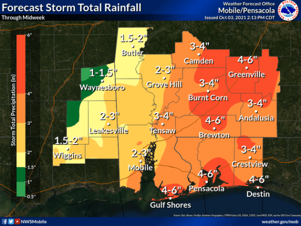 About 2 to 4 inches of rain have already fallen across southern Santa Rosa and Okaloosa counties and an additional 1-inches is possible, according to the National Weather Service’s flash flood warning issued at 8:20 a.m. Monday morning.