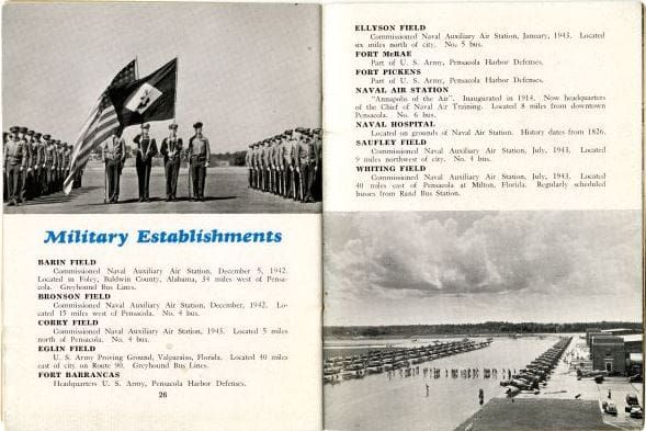 This booklet, dating back to 1944, shows the influence the military had on Northwest Florida nearly 80 years ago. Developed by the Pensacola Municipal Advertising Board to promote the area to visitors, the booklet contains information on everything from history, bus routes and local attractions to a two-page spread referencing numerous military installations in the area.