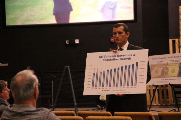 County Administrator Dan Schebler fielded tough questions about spending of tax dollars Monday during the first of two citizen budget workshops. The first was hosted at Woodbine Church.