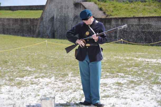 Caleb Pascoe is at historic Fort Pickens taking practice shots with a black powder rifle in preparation for a demonstration later that morning.
