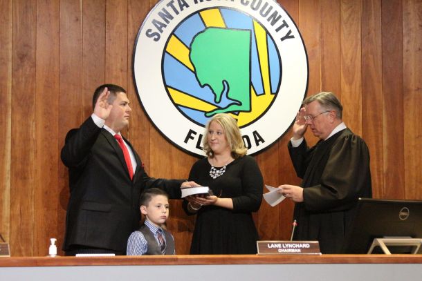 Newly sworn-in District 1 County Commissioner Sam Parker said he would work to improve infrastructure and promote business in county industrial parks Tuesday, Nov. 15, during the swearing-in ceremony for the Santa Rosa County Board of County Commissioners.