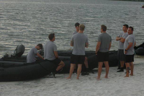 Arianna Clemente-Hunter wades through the warm water of the Navarre Sound and hops into one of the inflatable Zodiac boats at Hurlburt Field Thursday evening.