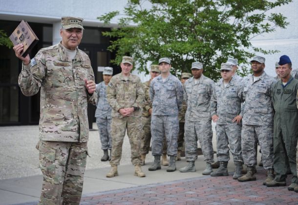 Lt. Gen. Brad Heithold, AFSOC commander, was surprised April 29 by a crowd of Airmen who presented him with an engraved invitation to his AFSOC Order of the Sword induction ceremony.