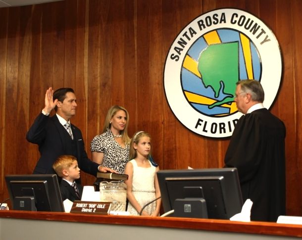 Three Santa Rosa County commissioners were sworn in for four-year terms Tuesday morning. Incumbent Robert “Bob” Cole is beginning his fourth term, and two commissioners with the same last name, Williamson, are now serving on the board.