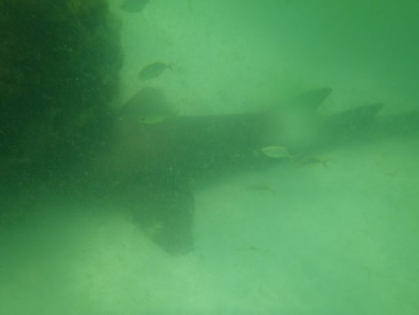 A nurse shark that had apparently won a battle with a fisherman became snagged July 8 at the Navarre Beach Marine Sanctuary Gulf-side reef. Thanks to the quick response of two divers and a local swimmer, the shark was freed and able to go on its way.