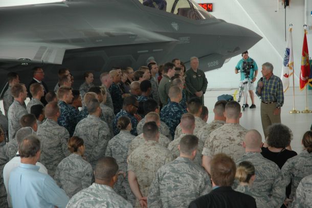 Secretary of Defense Chuck Hagel met with pilots at Eglin Air Force Base before speaking to troops inside a hangar there July 10. Hagel said he was confident in the F-35 aircraft, which is currently grounded and under investigation after one of the aircraft caught fire on the runway June 23.