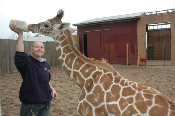 Zookeeper Megan Heidenreick bottle feeds Gamba, a 2-month-old giraffe at Gulf Breeze Zoo.