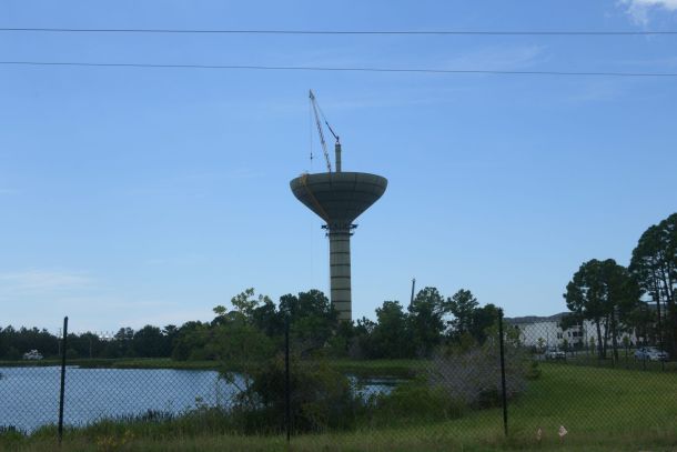 Driving along Highway 98, you might see a tall object resembling a bird bath sticking above the tree line near the intersection with Highway 87 S.