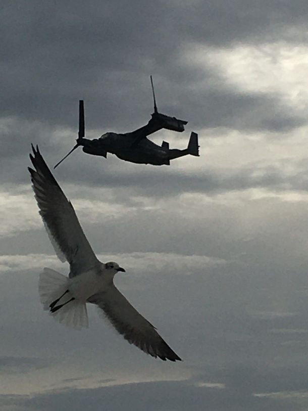 This timely photo of a V-22 Osprey and a seagull competing for airspace was taken by Peggy Lofton in Destin.
