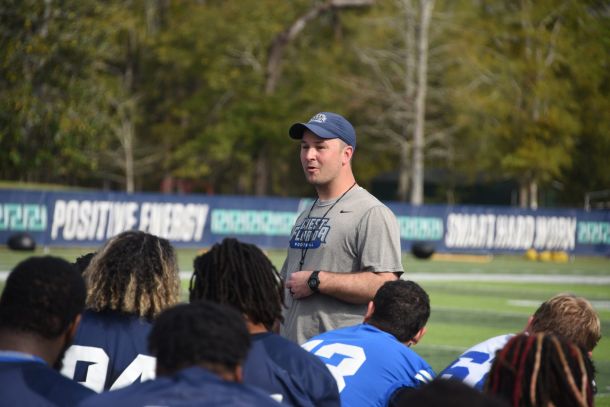 Kaleb Nobles talks with his team after the end of a University of West Florida spring practice on a sun-splashed morning in early March.