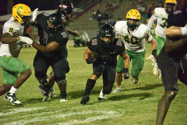 Mathews, running with all-out effort, often plowing through defenders for extra yards, had scored two touchdowns in a season opener against Catholic here on a brutally hot and humid evening at Bennett C Russell Stadium.