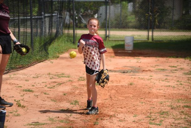 Young softball players spend a hot summer morning working on their swing, their pitching technique and their ability to play defense in the field, among other skills.