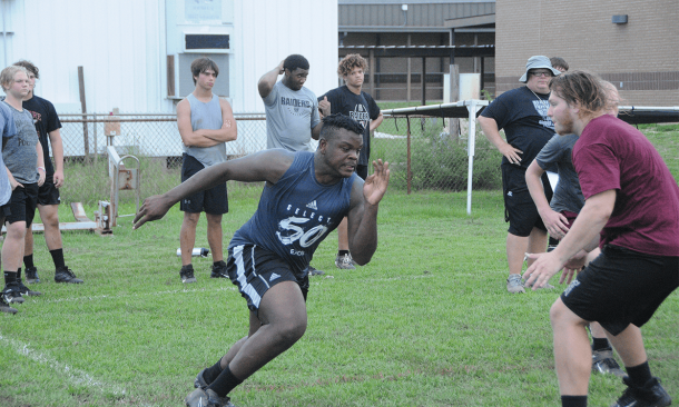 Lemuel Wilson is asked by his position coach to step off to the side of where a blocking drill is taking in practice and give a younger player pointers during a summer workout last Thursday morning.
