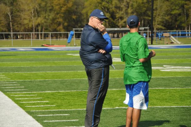Navarre running backs coach Tony Carter sits down next to one of the college football coaches on hand for the recruiting fair in the high school library Friday afternoon.