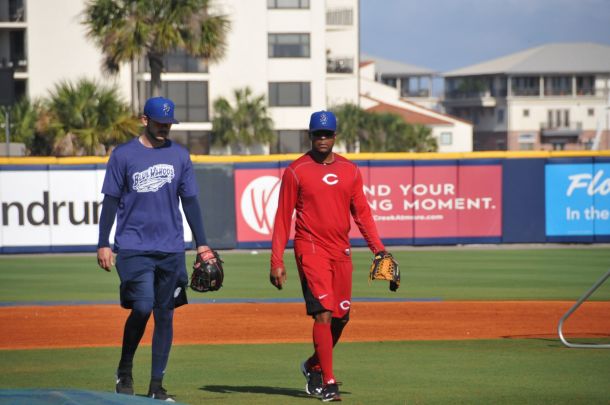 Batting practice ends for the Pensacola Blue Wahoos and Hall of Fame shortstop Barry Larkin heads off the field, walking alongside one of the young prospects in the Cincinnati Reds organization.