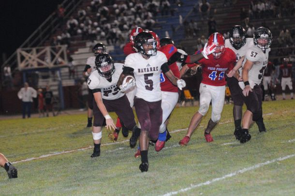 Dante Wright sprinted down the middle of the field, a defender chasing him as the ball spiraled toward him on the first play of Navarre’s opening possession of the game against Pine Forest Friday night.